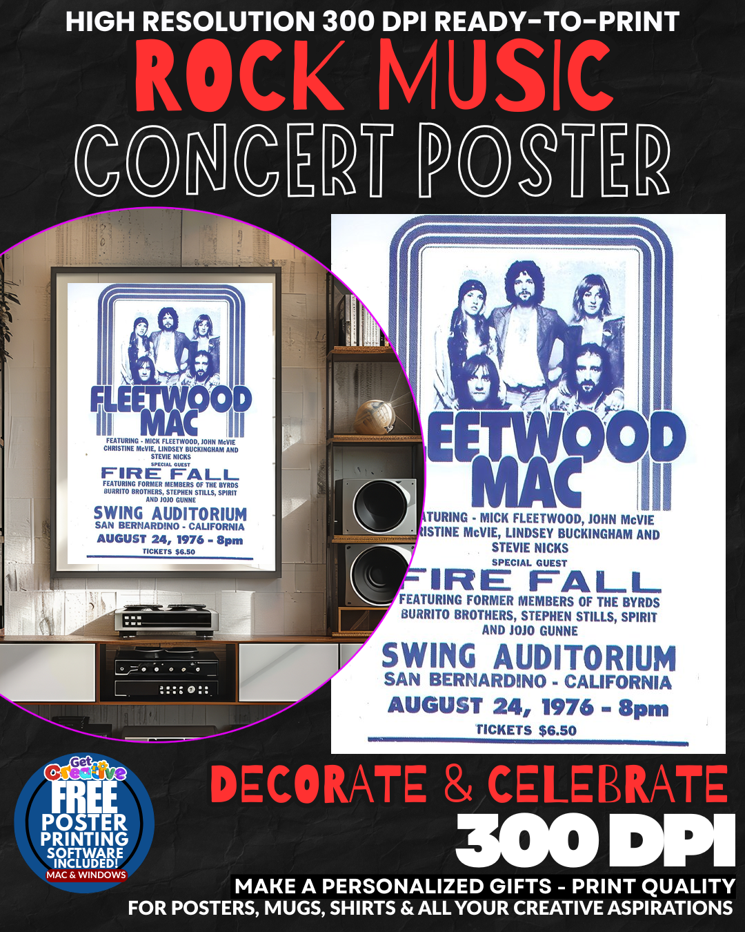 RELIVE THE MAGIC OF ROCK ROYALTY! Transport your walls into the LEGENDARY world of Fleetwood Mac with this STUNNING concert poster that captures the raw ELECTRICITY and timeless sophistication of rock’s most iconic band! Feel the THUNDEROUS energy of their greatest hits flowing through your space as this magnificent wall art transforms any room into a shrine to musical GREATNESS! Whether you’re decorating your den, office, or music room, this poster delivers that perfect blend of vintage rock glamour and artistic excellence that only TRUE music legends can inspire! Every glance will remind you of those UNFORGETTABLE melodies and the band’s incredible journey through rock history! GRAB this piece of musical history today!