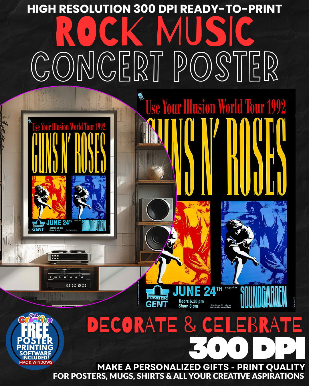 ROCK AND ROLL ROYALTY COMMANDS YOUR WALL! Transform any space into a LEGENDARY rock shrine with this EXPLOSIVE Guns N Roses concert poster that SCREAMS pure rock and roll REBELLION! Feel the RAW POWER and untamed energy of rock’s most DANGEROUS band electrifying your room with every glance! This isn’t just wall art – it’s your personal gateway to the WILD SIDE of rock history that will have every visitor knowing you’ve got SERIOUS rock credibility! Whether it’s your bedroom, den, or garage, this poster delivers that AUTHENTIC hard rock attitude that separates the true fans from the pretenders! GRAB this piece of rock immortality NOW!
