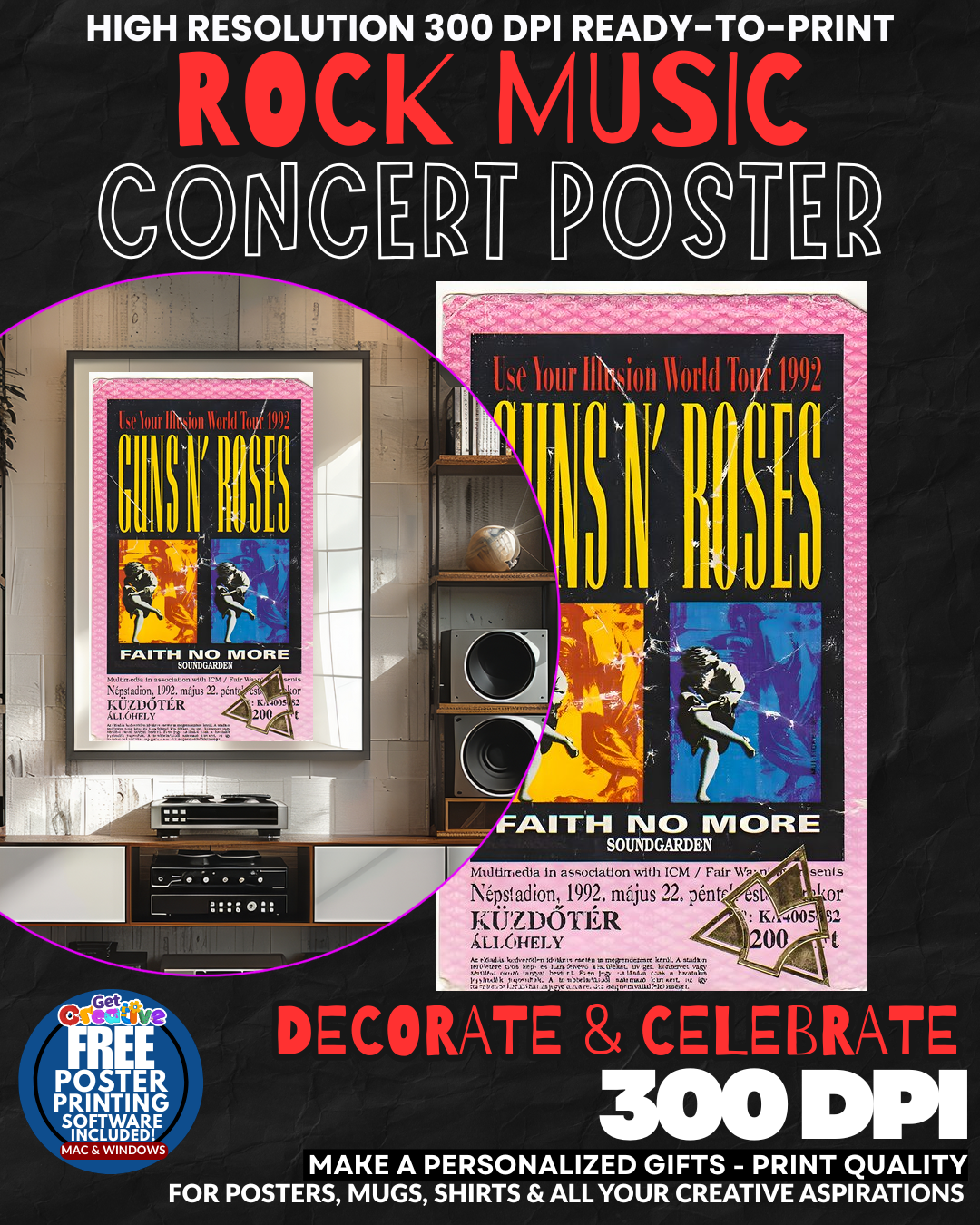 ROCK AND ROLL ROYALTY FOR YOUR WALLS! Transform your space into a LEGENDARY SHRINE with this EXPLOSIVE Guns N Roses concert poster that captures the RAW POWER and REBELLIOUS SPIRIT of rock’s most dangerous band! This isn’t just wall art – it’s a DECLARATION of your musical sophistication and rock credentials that will have every visitor knowing they’re in the presence of someone who understands REAL MUSIC! The iconic imagery radiates pure ROCK ENERGY and instantly elevates any room from ordinary to EXTRAORDINARY with the unmistakable swagger of Axl, Slash and the boys! Whether it’s your bedroom, garage, or man cave, this poster commands RESPECT and showcases your connection to rock history’s most EXPLOSIVE moments! GRAB this piece of rock immortality NOW!