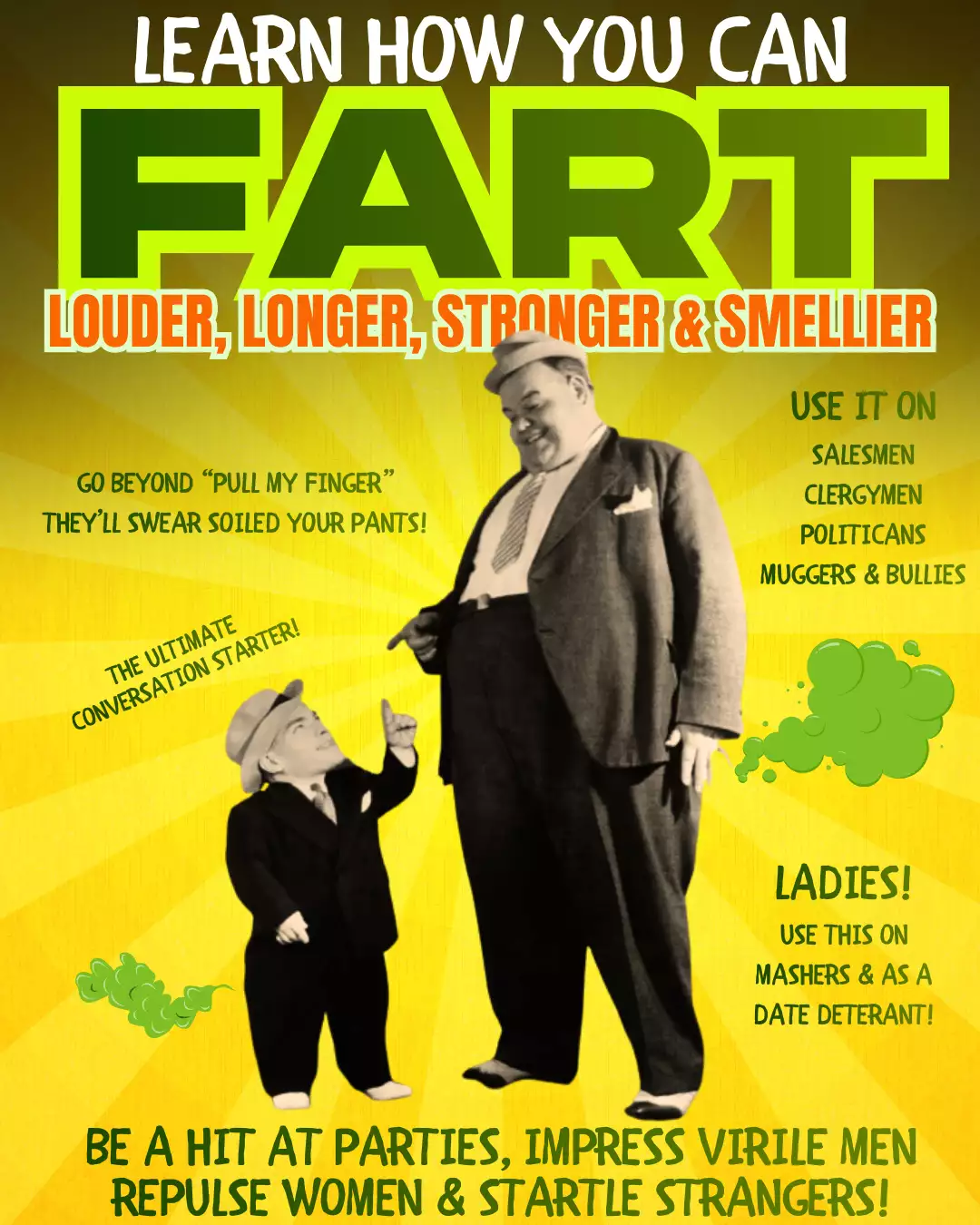 MASTER THE ART OF THUNDEROUS BODILY ACOUSTICS! FINALLY! The SCIENTIFIC SECRETS to producing EARTH-SHAKING gas emissions that will ASTOUND friends and TERRORIZE enemies! This EXPLOSIVE manual reveals the FORBIDDEN TECHNIQUES used by professional pranksters to generate MAXIMUM VOLUME, EXTENDED DURATION, and DEVASTATING AROMATIC IMPACT! Transform your digestive system into a WEAPON OF MASS DESTRUCTION with step-by-step instructions for achieving LEGENDARY flatulent prowess! No longer will you suffer the embarrassment of weak, pathetic gas – NOW you’ll command RESPECT through sheer sonic DOMINANCE! GRAB this POWERFUL guide and become the UNDISPUTED CHAMPION of controlled gas warfare!