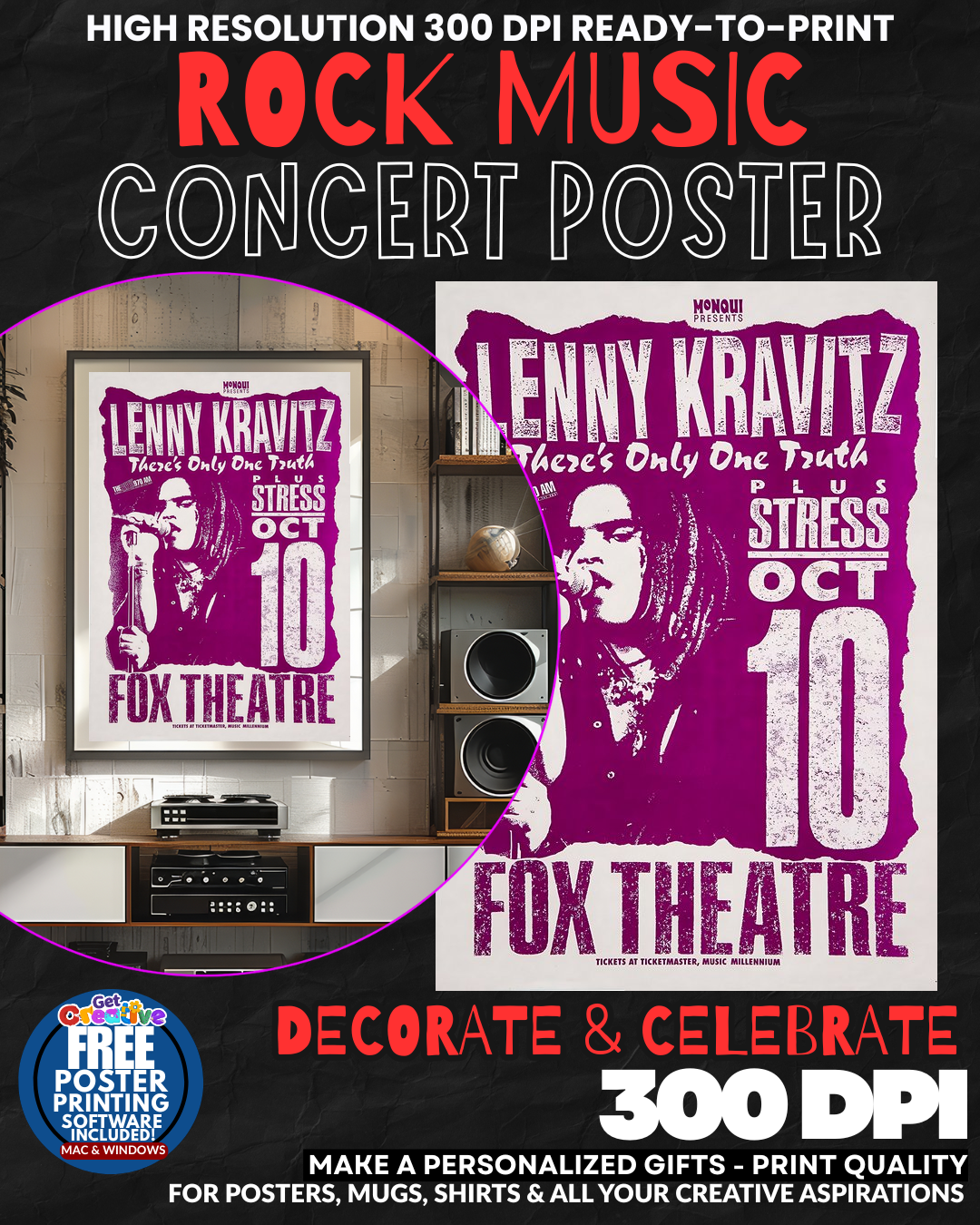 BRING THE ELECTRIC SOUL OF ROCK ROYALTY TO YOUR WALLS! Transform any room into a SHRINE OF PURE MUSICAL MAGNETISM with this stunning Lenny Kravitz concert poster! Feel the RAW ENERGY and sophisticated rebellion of one of rock’s most stylish icons radiating from your wall every single day! This isn’t just wall art – it’s a DECLARATION of your impeccable taste in legendary performers who define cool! Watch as guests are instantly drawn to the HYPNOTIC POWER of Kravitz’s unmistakable presence dominating your space with rock and roll sophistication! GRAB this piece of music history and let Lenny’s electric charisma electrify your home today!