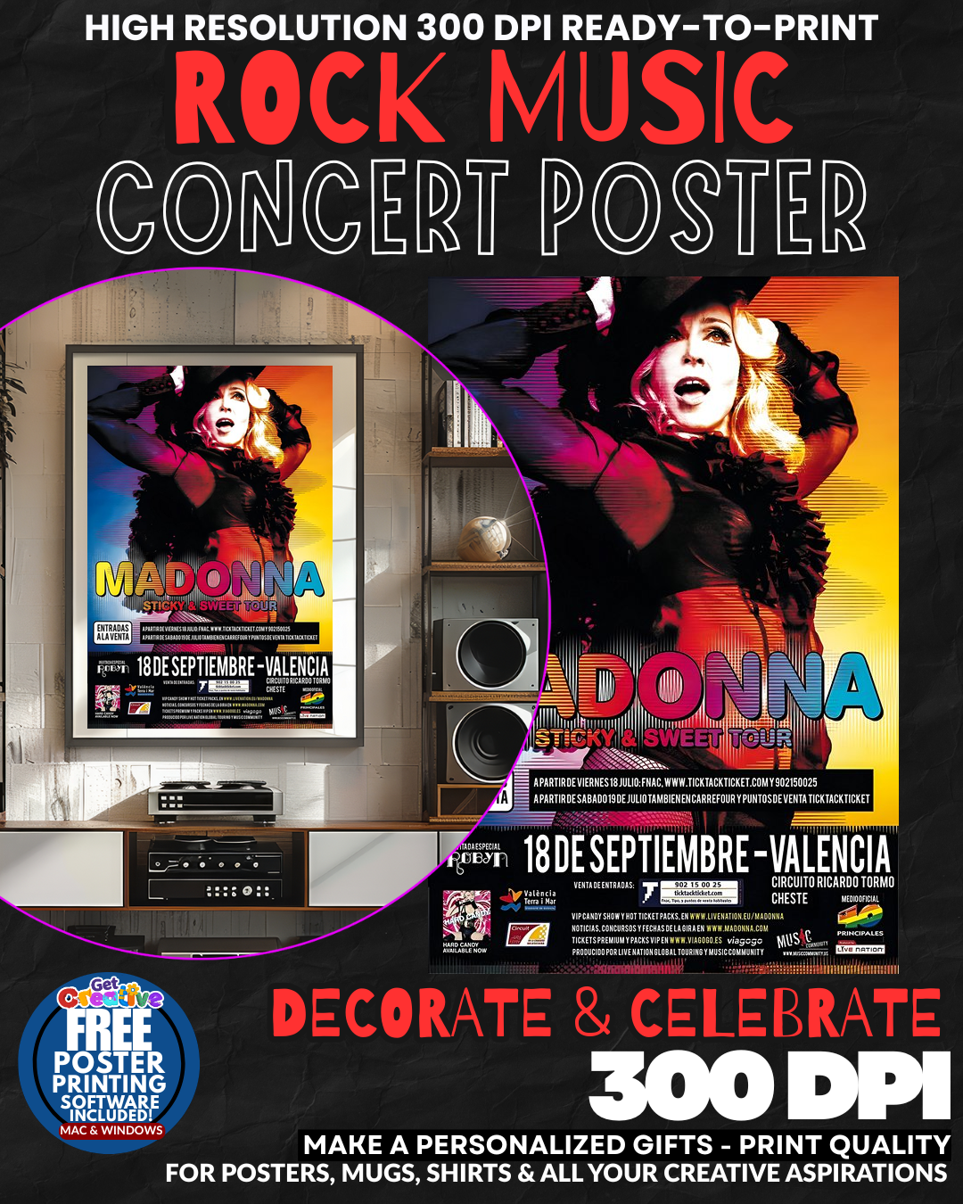 FEEL THE ELECTRIC PULSE OF POP ROYALTY! Transform your space into a SHRINE TO THE QUEEN OF POP with this stunning Madonna concert poster that captures the raw MAGNETISM and rebellious spirit of music’s most iconic revolutionary! This isn’t just wall art – it’s a PORTAL to the glamorous world of sold-out stadiums, diamond-studded performances, and the unstoppable force that redefined what it means to be a superstar! Every glance will flood your room with the sophisticated energy of red carpet brilliance and chart-topping dominance that only the Material Girl herself could deliver! GRAB this piece of music history and let Madonna’s legendary presence electrify your walls!