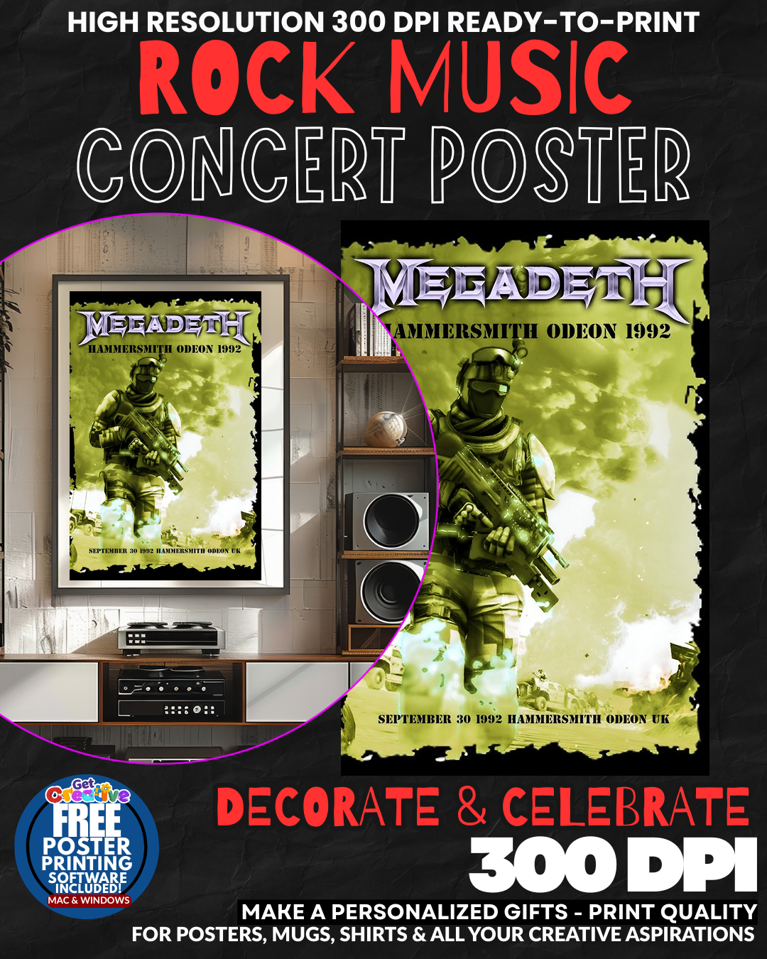 UNLEASH THE FURY OF METAL’S MOST RELENTLESS WARRIORS! Transform your space into a SHRINE TO THRASH METAL SUPREMACY with this EXPLOSIVE Megadeth concert poster that captures the RAW POWER and LIGHTNING-FAST INTENSITY of metal’s most uncompromising legends! Feel the CRUSHING RIFFS and MACHINE-GUN PRECISION of Dave Mustaine’s musical genius BLAST through your walls as this ELECTRIFYING artwork commands INSTANT RESPECT from every metalhead who enters your domain! Your friends will BOW DOWN to your superior taste in both music and wall art as this THUNDEROUS poster transforms any room into a TEMPLE OF METAL MAYHEM! GRAB this piece of rock history NOW!