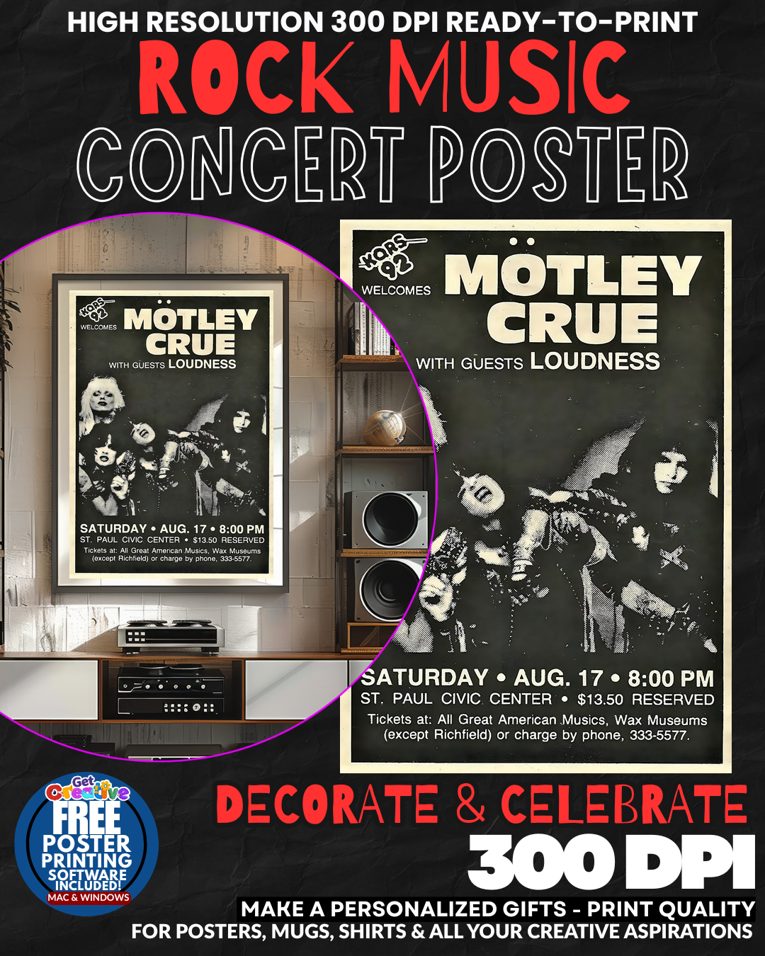 ROCK AND ROLL ROYALTY COMMANDS YOUR WALL SPACE! Transform your boring walls into a SHRINE OF PURE ROCK POWER with this electrifying Motley Crue concert poster that screams WILD SIDE REBELLION! Every glance delivers that heart-pounding rush of stadium lights and leather-clad ROCK GOD ENERGY that made the Crue absolute legends of the Sunset Strip! Your guests will be STUNNED by the raw magnetism radiating from this ultimate tribute to hair metal’s most notorious bad boys! Feel the unstoppable force of Tommy’s thunderous drums and Nikki’s bass lines PULSING through your space every single day! GRAB this piece of rock history NOW!