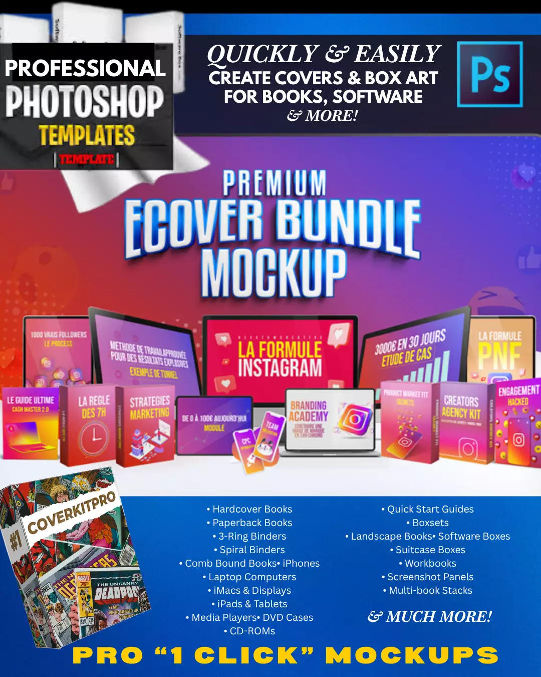 TRANSFORM YOUR CREATIVE VISION INTO STUNNING PROFESSIONAL REALITY! This INCREDIBLE Premium Ecover Mockup Bundle delivers the ULTIMATE collection of high-impact Photoshop templates that instantly elevate your digital products to BREATHTAKING professional standards! Watch as your ebooks, courses, and software designs explode with IRRESISTIBLE visual appeal that commands attention and drives sales like never before! These premium mockups transform ordinary covers into MAGNETIC masterpieces that scream quality and sophistication to every potential customer! Your creative projects will radiate the same polished brilliance as top-tier publications and million-dollar brands! GRAB this game-changing bundle NOW and watch your designs dominate the marketplace!