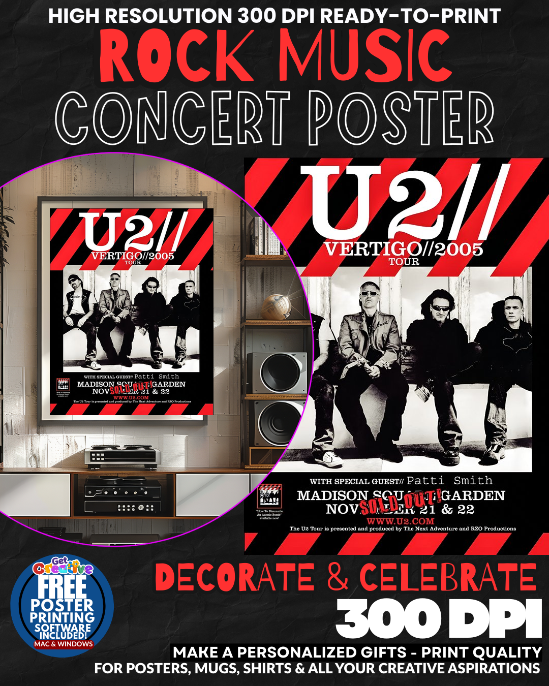 U2 5 Music Rock Concert Poster Wall Art. Capture the essence of U2 with this striking wall art poster, perfect for any fan’s collection.